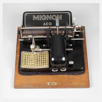 Modell 4, AEG Werk Erfurt, um 1940, schwarz lackiertes Eisengestell, vernickelte Metallteile, Zwei-Tast-Mechanismus der Buchstabenkombinationen über ein Zahnrad an eine Druckwalze übersetzt, im original eichefurniertem Etui, Alters- und Gebrauchsspuren, Maße 23 x 30 cm.