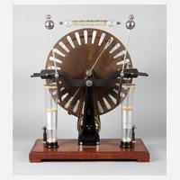 sogenannte Wimshurstmaschine, 1920er Jahre, ungemarkt, zur Erzeugung von Hochspannung mit Hilfe der Influenz, Holzplatte mit zwei vertikal montierten Metallscheiben und zwei Leidener Flaschen, beigegeben diverse Röhren, etwa einer Geißlerröhre, gepflegter Zustand, H 61 cm.