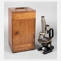 um 1920, gemarkt Emil Busch AG Rathenow, geschwärzter Eisengussfuß mit vernickelten Metallteilen, drehbarer Dreifach-Revolver, mit Zubehör und nicht passendem Anleitungsheft, Alters- und Gebrauchsspuren, H 30 cm.