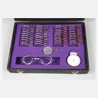 Mitte 20. Jh., ungemarkt, lederverkleidetes Etui mit 41 Linsen in verschiedenen Sehstärken mit passendem Probegestell sowie kleinem Messgerät, gute Erhaltung, komplett, Maße Etui 5 x 30 x 22 cm.