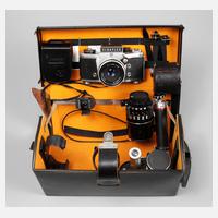 um 1970, Kamera Elbaflex VX1000, verchromtes, teils mit schwarzem Leder verkleidetes Metallgehäuse, Objektiv 1:2,8 F=50 sowie Weitwinkelobjektiv Quinar 1:3,5 F=135, Telekonverter Sunlux, Belichtungsmesser Sixtar der Firma Gossen, weiteres Zubehör, funktionstüchtig, in schwarzem Lederkoffer.