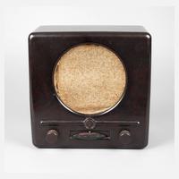 rückseitig gemarkt Deutscher Kleinempfänger, Roland Brandt, schlichtes Bakelitgehäuse, mit drei Reglern ohne Anzeige, Lautsprecher mit Textilbespannung, Funktion nicht geprüft, originale Elektrik, Maße 24 x 24,5 x 12 cm.