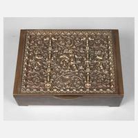 um 1930, Messing zaponiert, rechteckiger Korpus, der scharnierte Deckel mit reliefierter Szene tanzender Putti zwischen Blatt- und Blütenranken, Innenleben aus Tropenholz, mit eingelassenem Spielwerk, das beim Anheben des Deckels aktiviert wird, Werk läuft, Maße 5 x 16,5 x 12 cm.