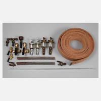 1. Hälfte 20. Jh., Guss, Messing, Glas und Kunststoff, 16 Teile, darunter Ablasshähne, Absperrventile, Öler mit Glasbehälter, Lederiemen etc., dazu Fettbuchse bezeichnet Stauffer System 8, untersch. Alters- und Gebrauchsspuren, L Öler max. 16 cm, B Riemen 7 cm.