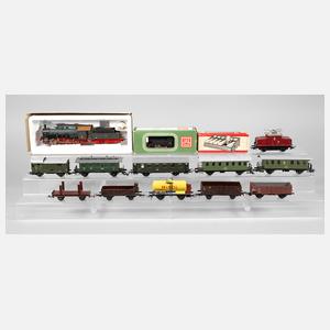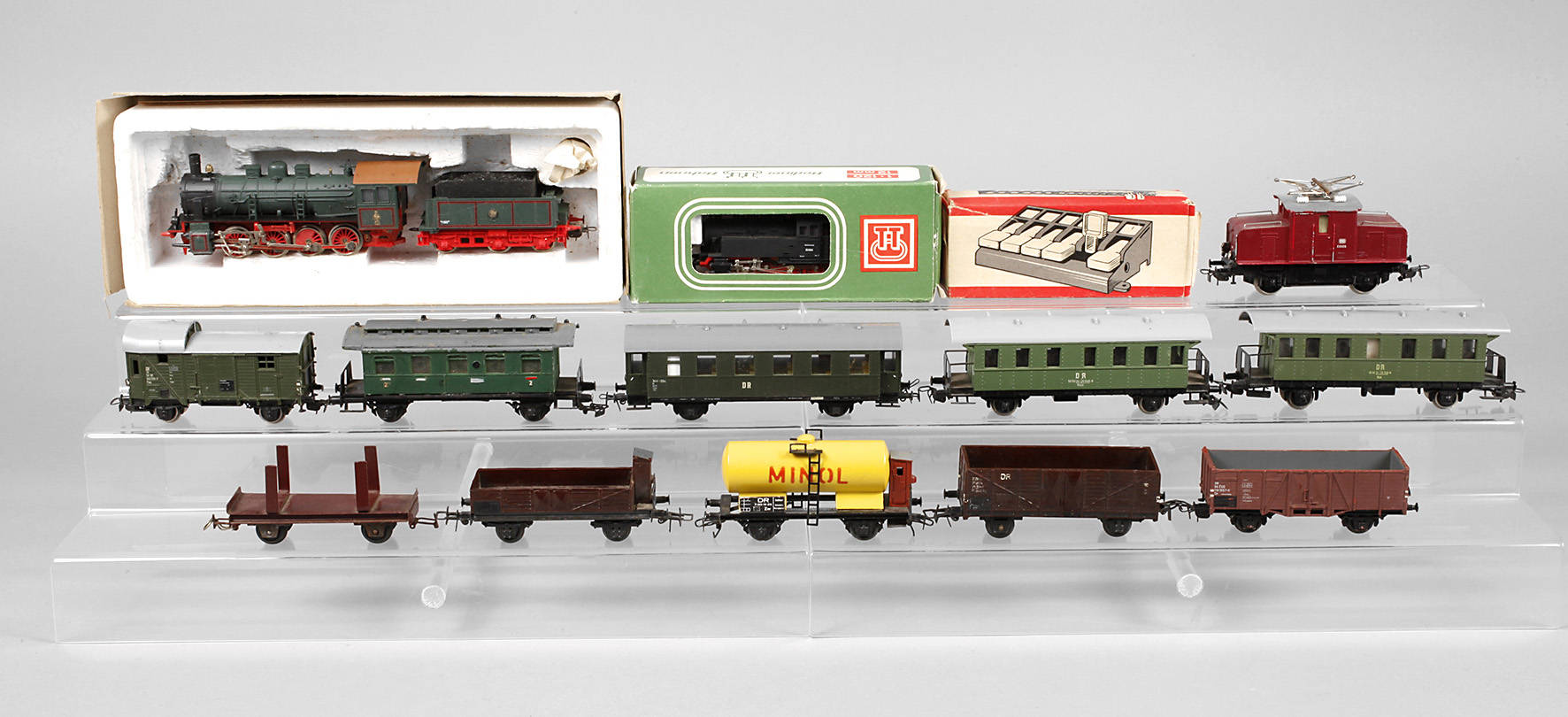 DDR, vorw. gemarkt, vorw. Kunststoff farbig gefasst, Spur H0, bestehend aus Güterlokomotive G 8 (6330) mit orig. Karton und Anleitung, E-Lok 6905, drei Personenwagen, Güterzugpackwagen, Minol Tankwagen und vier Güterwagen, dazu Personenwagen mit Klebeetikett G (in G) sowie Zeuke Tastenpult und Berliner TT Bahnen Dampflokomotive BR 81 (2210), diese beide in orig. Karton, Funktion nicht geprüft, min. bespielte Zustände, ein kleines Blendteil der Schlepptenderlok lose, L diese gesamt 22,5 cm.