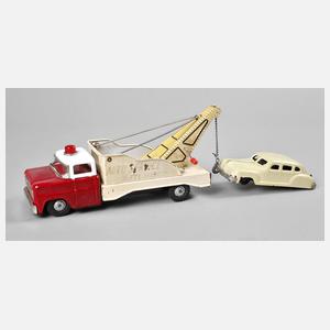 um 1960, Ford Abschleppwagen bezeichnet I.K.-0973, Blech farbig lackiert bzw. lithogr., mit Batteriefach, Dach-Blinklicht, Chassis-Aufschrift ”Auto Service Tel. 18156” sowie mittels Kurbel verstellbarem Haken, Kunststoff-Frontscheibe def., Funktion nicht geprüft, L 25 cm, dazu Limousine, gemarkt 800 Germany, VEB Spielwarenwerk, Patent-Lineol, Bakelitgehäuse und Blech, intaktes Uhrwerk, Bakelit am Rand bestoßen, Vorderachse verbogen, L 13,5 cm.