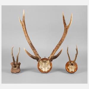 Mitte 20. Jh., zwei Rehbockgehörne sowie ein Sechsender, jeweils auf Holzplatte montiert, L max. 65 cm.