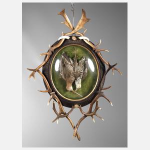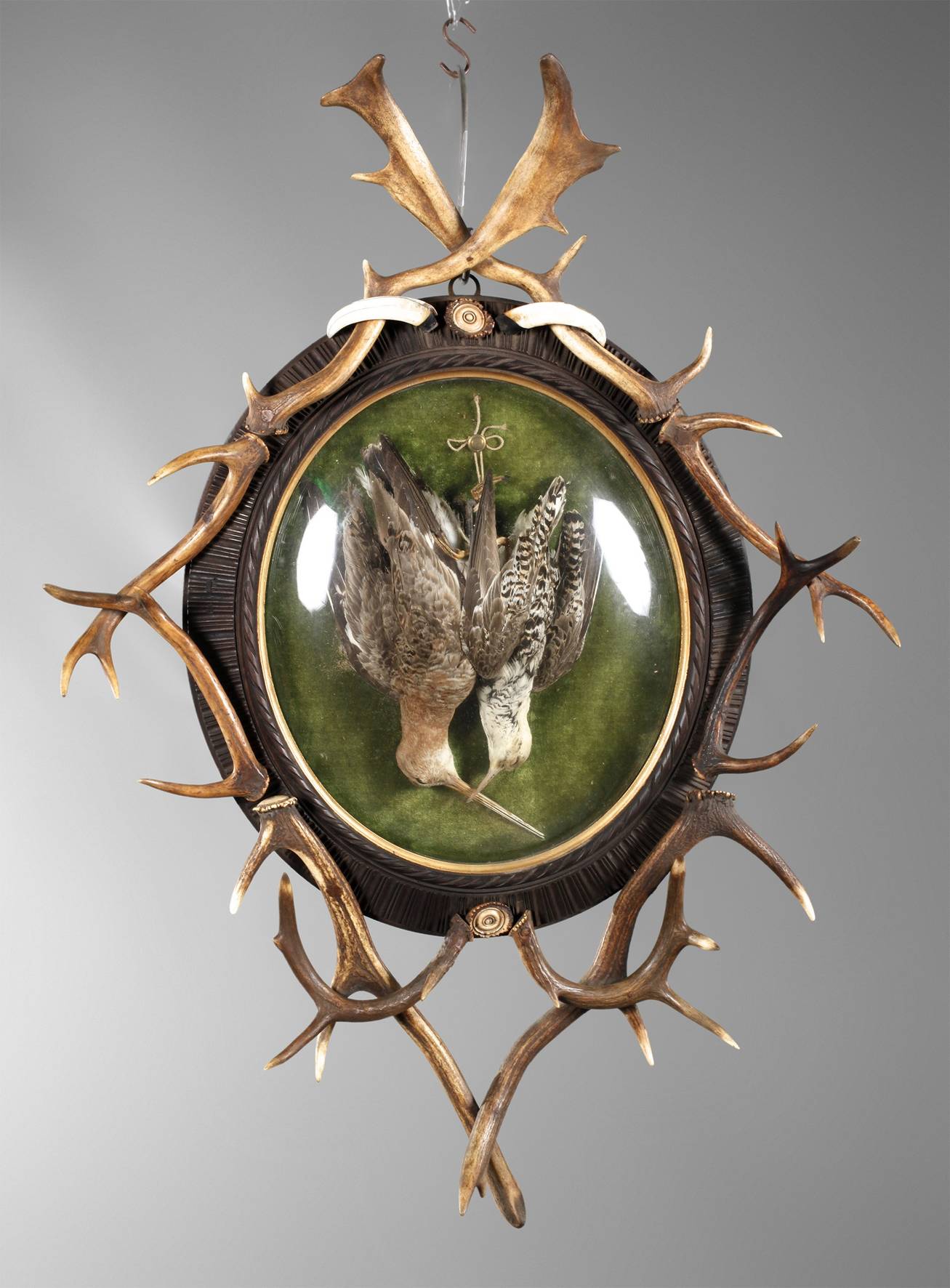 um 1860, rückseitig Firmenetikett Hans Kappelmeyer Fürth, fein geschnitzter Ovalrahmen mit gewölbtem Glas, verziert mit Hirschgeweihstangen und Keilerzähnen, H 99 x B 70 cm.