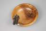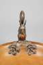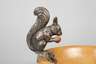 um 1920, Wurzelholz gedrechselt, tief gemuldete Schale mit vollplastischer Silbermontierung, gestempelt 800 sowie weitere Punzen, in Form eines Eichhörnchens, umgeben von Eichenlaub, beim munteren Knabbern an einer Haselnuss, min. Altersspuren, D 21 cm.