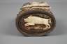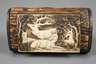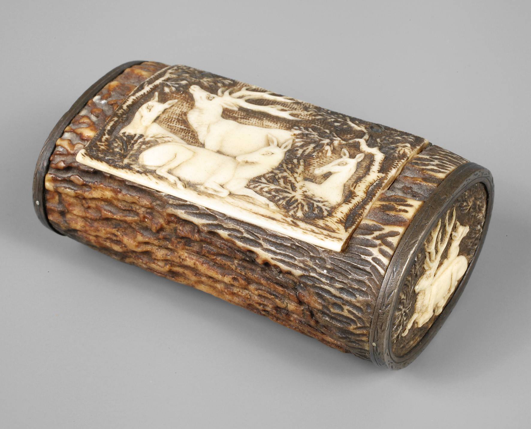 alpenländisch, 19. Jh., aus Hirschhorn gefertigt, flacher Korpus mit Silbermontierung und reliefiertem Eber bzw. Rotwildmotiv, der scharnierte Deckel ebenfalls verziert mit einem Hirschrudel, Altersspuren, L 8 cm.
