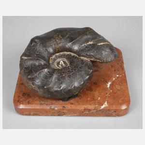 Fossil aus dem Trias-Zeitalter mit gut sichtbaren Lobenlinien, auf Steinsockel montiert, Maße ca. 19 x 16,5 cm, D Fossil ca. 16 cm.