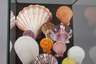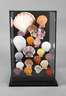 20. Jh., Tischvitrine mit 20 montierten Kammmuscheln, teils farbig gefasst, Maße 42 x 28 x 28 cm.