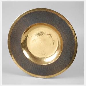 1930er Jahre, monogrammiert HP, Schriftzug Handarbeit, Messing handgetrieben, graviert und partiell kupferfarben patiniert, flache Fahne mit geometrischem Dekor und Zähnchenkante, rückseitig Gravur: zu 50. Geburtstag von deinen Kollegen Bauarbeitern des Bezirkes Rostock, leichte Gebrauchsspuren, D 40 cm. Künstlerinfo: deutscher Bauhauskünstler (1900 Halle bis 1945 Leipzig), arbeitete in der Metallwerkstatt unter Moholy-Nagy, Zusammenarbeit mit Marianne Brandt, übernahm später die Werkstatt Wolfgang Tümpel und hatte dann seine eigene Werkstatt in Leipzig.