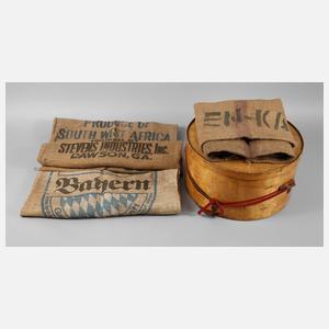 Anfang 20. Jh., zylindrische Transportkiste aus Spanholz mit Lederriemen, darin vier farbig bedruckte Lebensmittelsäcke unterschiedlicher internationaler Firmen, Alters- und Gebrauchsspuren, D 45 cm.