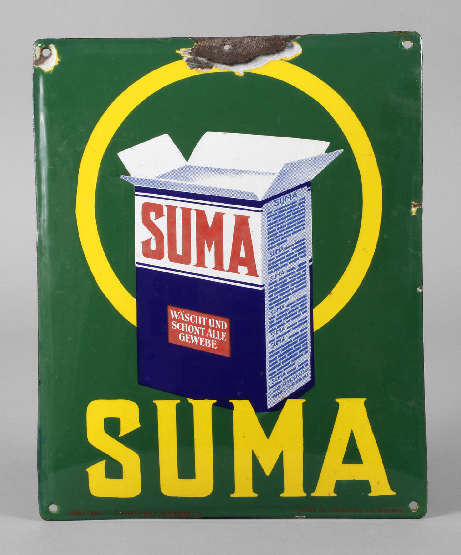 um 1920, gemarkt Ferro-Email, sowie C. Robert Dold Offenburg i. B., außerdem bezeichnet Eigentum der Sunlicht Ges. Mannheim, gebauchtes, hochrechteckiges Metallschild, mehrfarbig emailliert, mit fünf originalen Bohrungen, im Randbereich mit Emailleverlusten Z 2, Maße 35 x 28 cm.