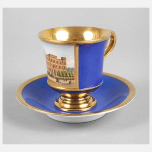 Rautenschild mit Stern 1850–1862, zwei Ritzstriche, geprägtes Monogramm APWr. und Nummer 5, handschriftl. bezeichnet, Tasse mit hohem gekehlten Fuß, kraterförmiger Kuppa, ausgestelltem Lippenrand und ohrenförmigem Henkel, reiche Vergoldung und blauer Fond, schauseitig Rechteckkartusche mit feiner polychromer Vedutenmalerei, Ansicht des Palais in München mit Figurenstaffage, passende Untertasse ungemarkt, Tasseninnenseite mit winzigem Herstellungsfehler, Untertasse minimal berieben, H gesamt 10,5 cm.