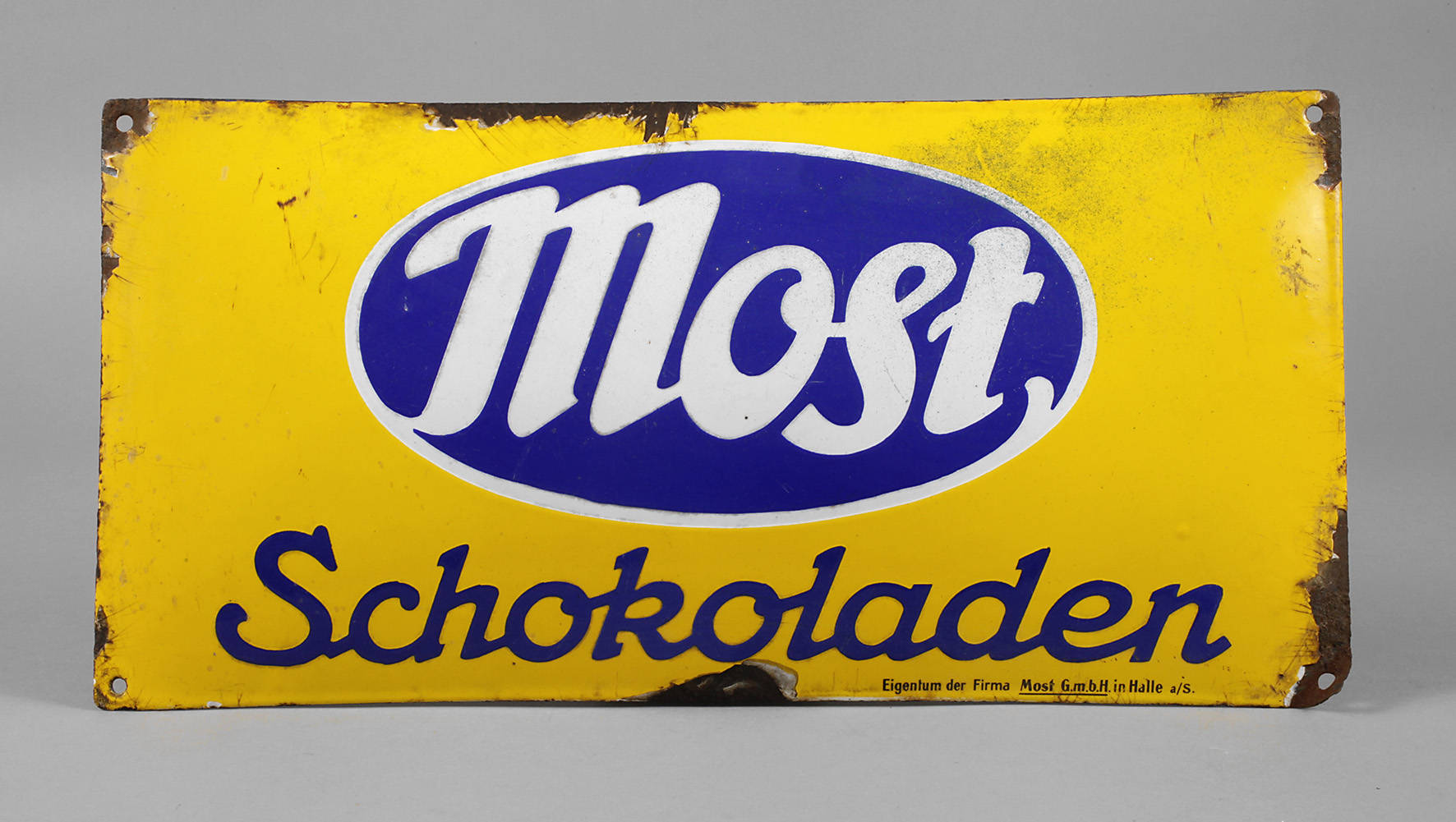 um 1920, ohne Hersteller, stark gebauchtes, langrechteckiges Schild, vierfarbig emailliert, bezeichnet Eigentum der Firma Most GmbH in Halle a/S., vier originale Bohrungen, Substanzverluste im Randbereich, Z 2–3, Maße 25 x 49 cm.
