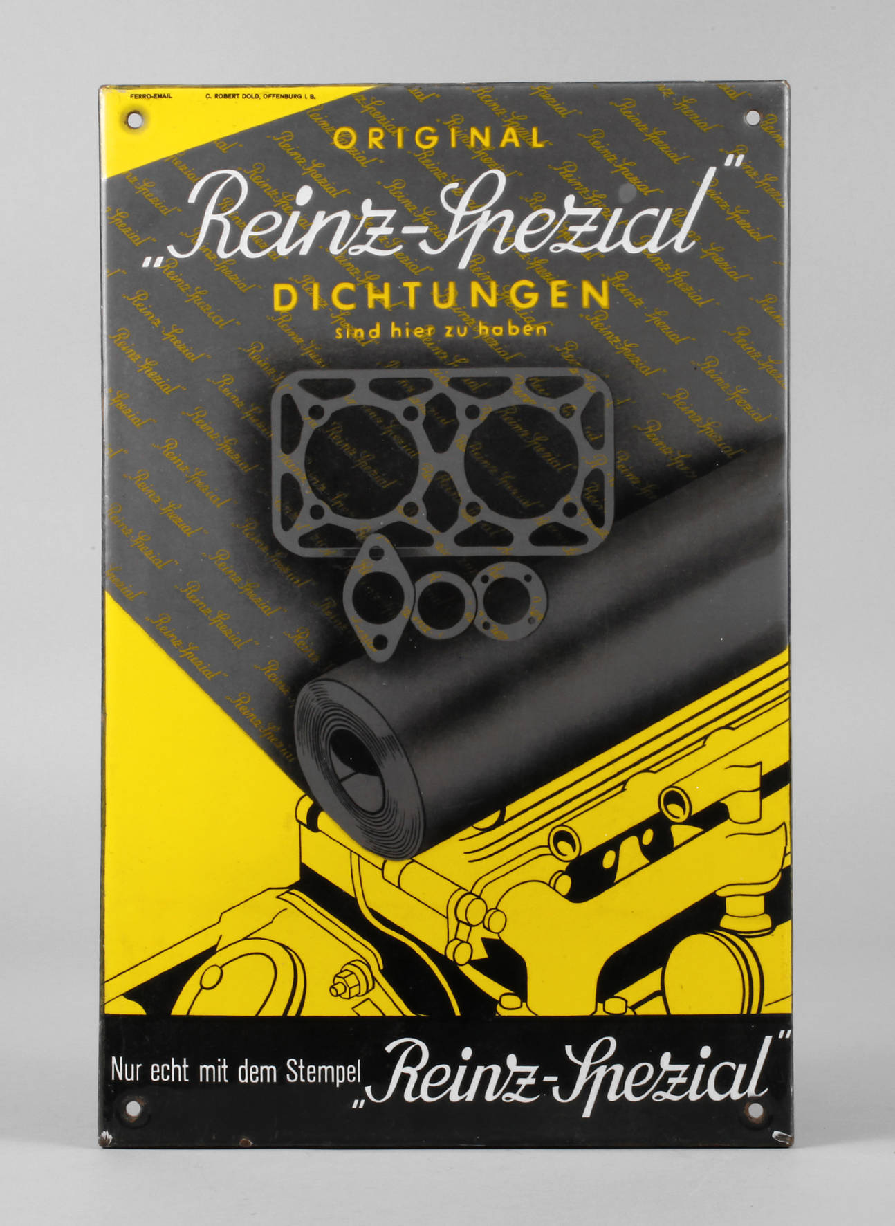 um 1930, gemarkt Ferro-Email sowie C. Robert Dold Offenburg i. B., hochrechteckiges, flaches Schild, mehrfarbig emailliert, mit vier originalen Bohrungen, Z 1, Maße 46 x 30 cm.