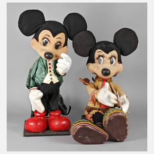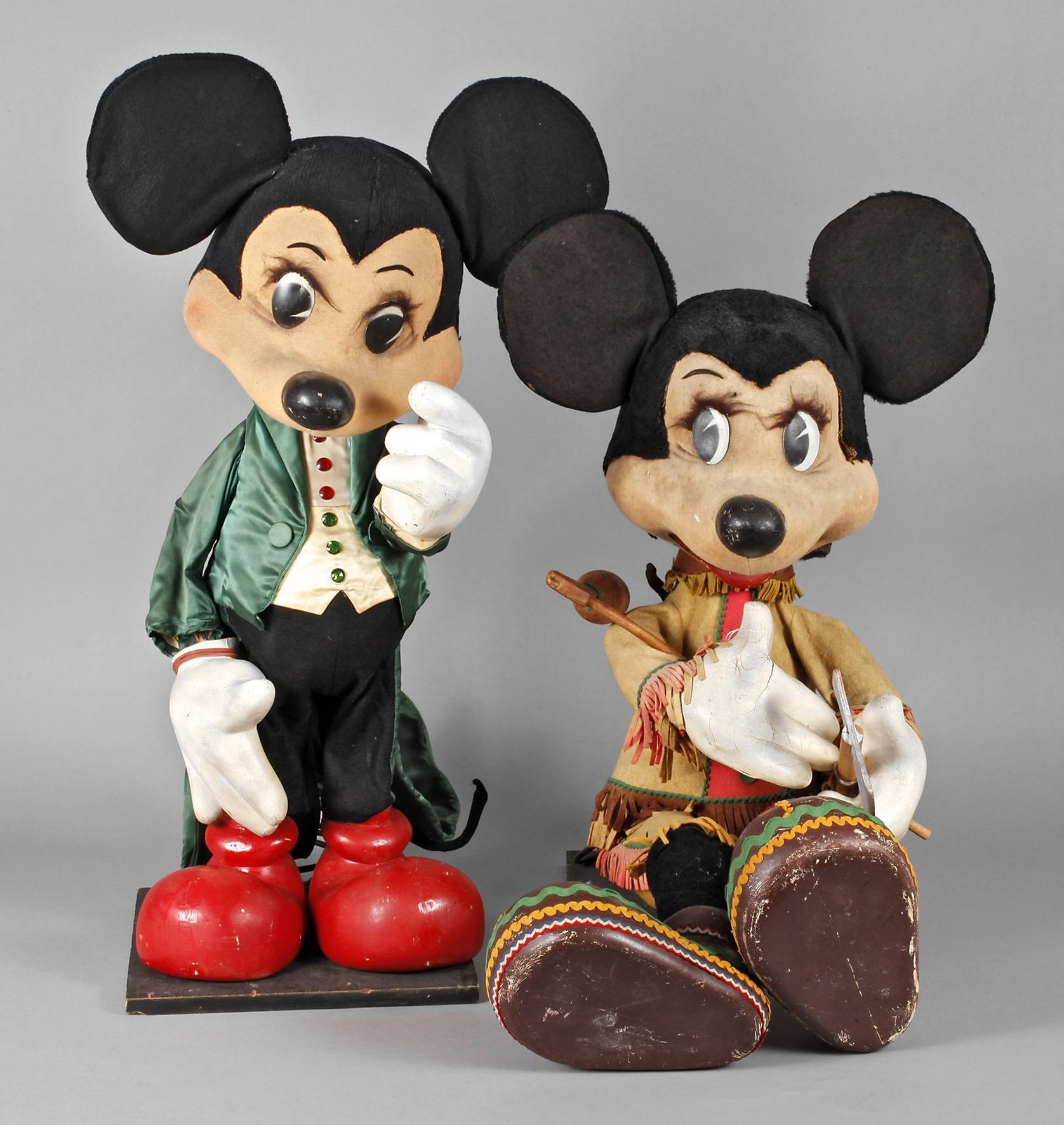 1970er Jahre, ungemarkt, bewegliche Schaufensterpuppen, Metallgestell mit Schaumstoff und Filz überzogen, Füße und Hände aus Massen, alt elektrifiziert, Funktion nicht geprüft, Altersspuren, H 77 und 86 cm.