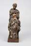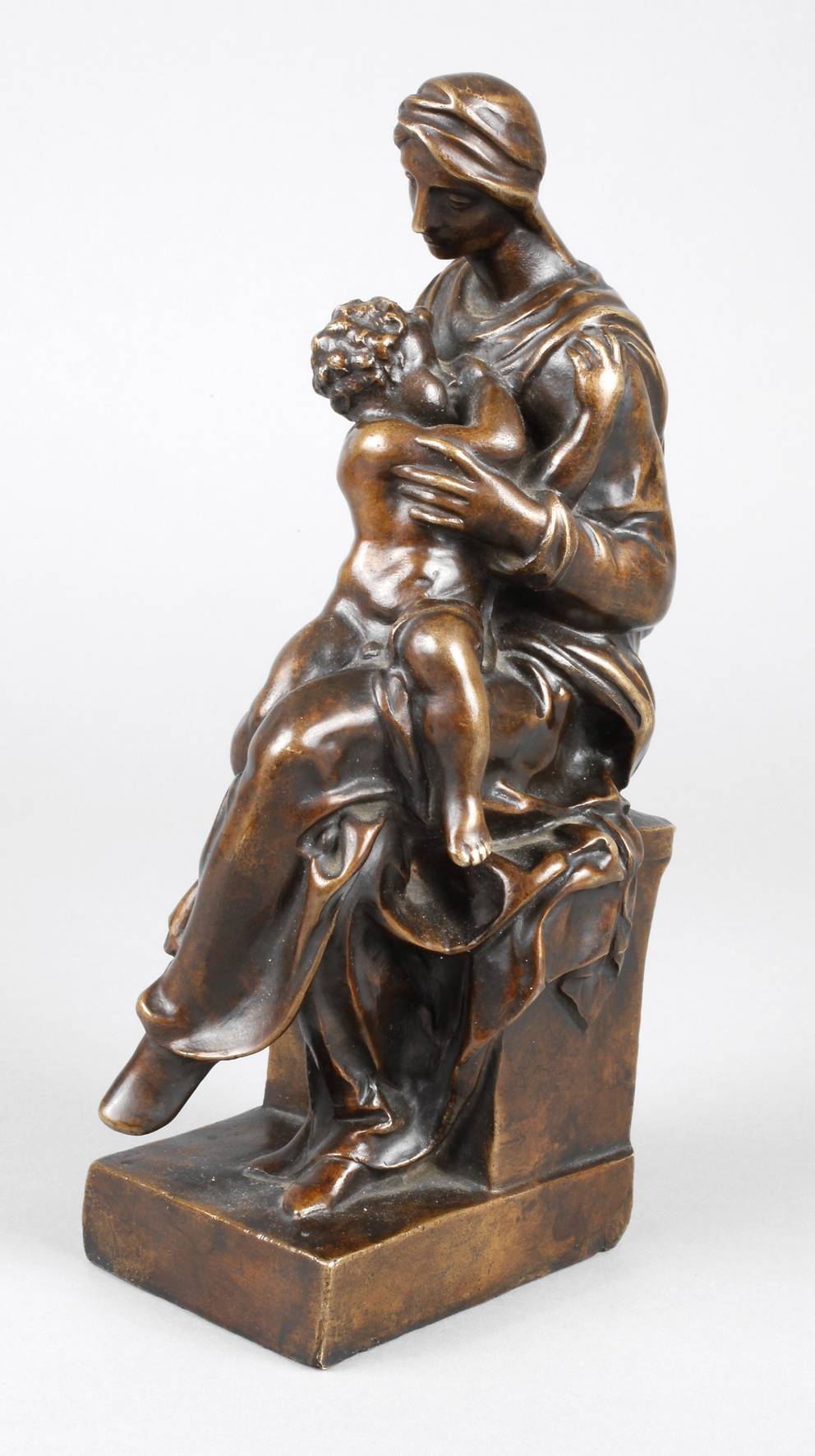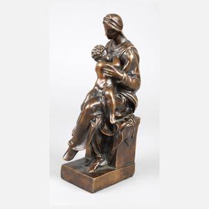 wohl Ende 19. Jh., unsigniert, Bronze braun patiniert, stark verkleinerte Kopie nach dem berühmten, zwischen 1524 und 1533 entstandenen Original von Michelangelo aus der Medicikapelle in Florenz, welche als Teil des Skulpturenschmucks für das Grab von Lorenzo Duca von Urbino entworfen wurde, Darstellung der Muttergottes mit dem Jesusknaben auf ihrem Schoß, welchem sie sich fürsorglich zuwendet, auf einem Postament sitzend, partiell berieben, H 27 cm.