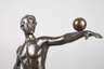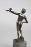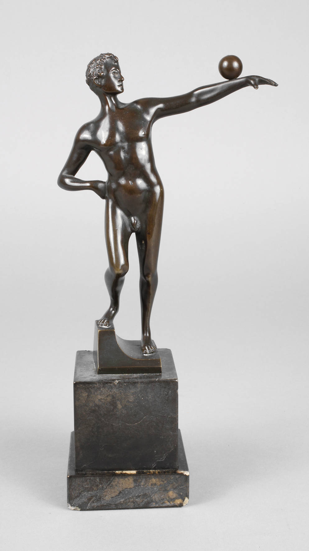um 1920, auf der Plinthe signiert E. Beck, Bronze dunkelbraun patiniert, stehender nackter Jüngling, einen Ball auf seinem linken ausgestreckten Arm balancierend, ein Fuß angewinkelt auf die sich einseitig nach oben verjüngende Plinthe gestellt, auf mehrteiligem, dunkelgrauem Marmorsockel, dieser minimal bestoßen, sonst sehr gute Erhaltung, H Bronze 19 cm, H gesamt 26,5 cm. Künstlerinfo: österreichischer Maler, Graphiker und Bildhauer (1879 Alt-Lengbach/Österreich bis 1941 Wien), studierte an der Akademie in Wien, Mitglied der Wiener Sezession und des Wiener Künstlerhauses, Quelle: Internet.