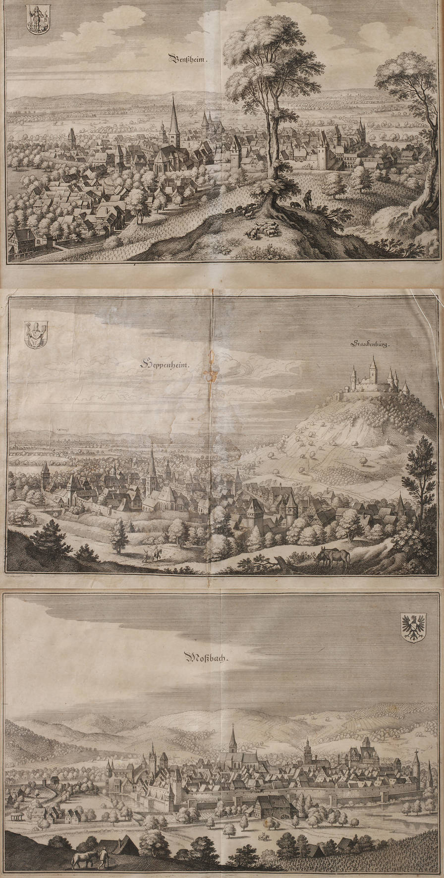 je eine Ansicht von Moßbach, Benzheim und Heppenheim, Kupferstiche, um 1650, unterschiedliche Erhaltungen, identisch unter Passepartout und hinter Glas gerahmt, eine Scheibe defekt, Falzmaß ca. 35 x 45 cm. Künstlerinfo: Schweizer Kupferstecher, Buchhändler und Verleger (1593 Basel bis 1650 Schwalbach), 1606–09 Schüler des Kupferstechers Dietrich Meyer und des Glasmalers Christof Murer in Zürich, 1610 bei Friedrich Brentel in Straßburg, 1625 Übernahme der Kunsthandlung seines Schwiegervaters Johann Theodor de Bry in Frankfurt am Main, nach seinem Tod führten seine Söhne Matthäus der Jüngere und Caspar sowie später deren Nachkommen den Verlag unter der Bezeichnung “Merian Erben” bis 1727 weiter und vervollständigten seine Hauptwerke “Topographia Germaniae” und “Theatrum Europaeum”, Quelle: Thieme-Becker und Internet.