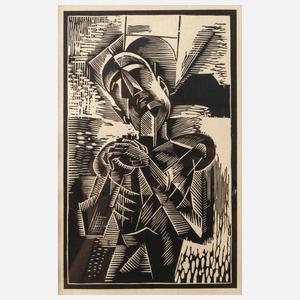 betende männliche Figur mit leicht geneigtem Haupt, kristallin wirkende, expressiv-kubistische Komposition, erschienen in „B. Kubišta“ bei U. S. V. Manes in Prag in einer Auflage von 600 Exemplaren, Holzschnitt, unter der Darstellung links typografisch bezeichnet „Prosba drevoryt, 24 ½ X 15 ½ cm, 1918“, an linker Blattkante Seidenpapier angeheftet, leicht gegilbt, unter Passepartout und hinter Glas in Biedermeierleiste gerahmt, Darstellungsmaß ca. 24,5 x 15,5 cm. Künstlerinfo: bedeutender tschechischer Maler und Grafiker (1884 Vlckovice bis 1918 Prag), 1903–1905 Besuch der Kunstgewerbeschule Prag, 1906–07 Studium in Florenz, nachfolgend Rückkehr nach Prag, Mitglied der Gruppe „Osma“ (Die Acht), 1910 Aufenthalt in Paris, 1911 besuchten Kubišta die Brückemitglieder Ernst Ludwig Kirchner und Otto Müller in Prag, ab August 1911 Mitglied der Brücke und Teilnahme an der Ausstellung der Neuen Sezession in Berlin und 1912 der Ausstellung des Sonderbundes Köln, während des Weltkriegs Soldat, 1918 an der Spanischen Grippe verstorben, Quelle: Österreichisches Biografisches Lexikon, Thieme-Becker, Vollmer und Wikipedia.