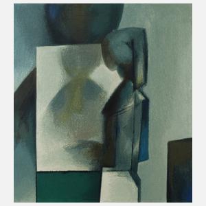 stilisierte weibliche Figur vor Spiegel, Komposition in Blau- und Grüntönen, Farblithografie, um 1980–90, unter der Darstellung in Blei rechts signiert „H. Losert“ und links nummeriert 133/200, unter Passepartout in Bilderträger gerahmt, Darstellungsmaß ca. 46 x 42 cm. Künstlerinfo: dt. Maler und Grafiker (1913 Neunkirchen/Niederösterreich bis 2002 Wörth an der Donau), 1929–31 Studium an der Kunstgewerbeschule des Österreichischen Museums für Kunst und Industrie in Wien bei Viktor Schufinsky, 1931–35 Studium an der Akademie der Bildenden Künste in Wien, 1939 Einberufung zum Kriegsdienst, ab 1945 in Rosenheim ansässig und hier als Freier Mitarbeiter bei Zeitungsverlagen tätig, 1952–53 Seminar an der Freien Waldorfschule Stuttgart, 1953 Umzug nach München und hier bis 1963 als Kunstpädagoge tätig, 1961 Gründung der Sommerakademie St. Johann bei Regensburg, 1965 Gestaltung der Sendereihe „Sehen und Sichtbarmachen – ein Zeichenkurs mit Spielregeln“ für den Bayerischen Rundfunk und vierteljährliche Nordamerikareise, ab 1971 Mitglied der Neuen Münchner Künstlergenossenschaft, 1973 Gründung der Freizeitakademie Bayerwald in Hofdorf, Gründungsmitglied der Sudetendeutschen Akademie der Wissenschaften und Künste, Quelle: Wikipedia und Internet.