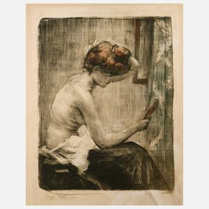 mit entblößten Oberkörper auf einem Stuhl sitzende Frau beim Frisieren, Farblithographie auf kaschiertem Japanpapier, links unter der Darstellung in Blei signiert, datiert und bezeichnet „Jenny Roth (19)05 n.d. … Lithografie“, Erhaltungsmängel, Darstellungsmaß 47 x 37 cm. Künstlerinfo: dt. Grafikerin (1882 bis 1956 München), war verheiratet mit dem Rechtsanwalt Dr. Oskar Maron.