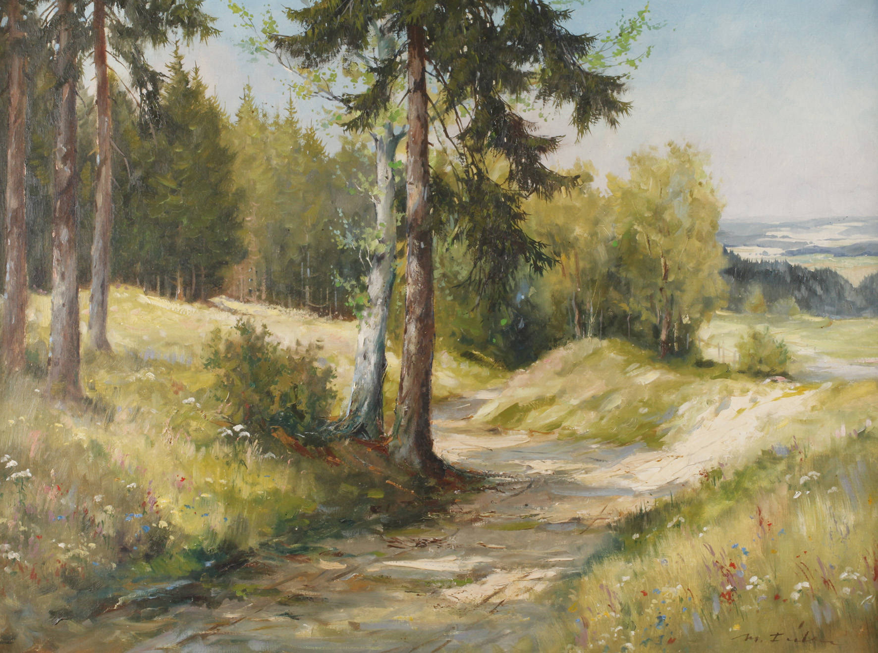 sonnige Waldlichtung, mit weitem Ausblick in sanft bewegte Vogtlandlandschaft, gering pastose Malerei, partiell in Spachteltechnik, Öl auf Leinwand, um 1960, rechts unten signiert ”M. Feiler”, minimal reinigungsbedürftig, original gerahmt, Falzmaß ca. 60 x 80 cm. Künstlerinfo: dt. Maler, Entwerfer und Illustrator (geboren 1925 in Plauen im Vogtland), 1939–43 Schüler der Plauener Kunstschule, gefördert von Kurt Geipel und Walter Löbering, tätig in Plauen, Quelle: Vollmer, Frank Weiß ”Malerei im Vogtland” und Internet.