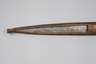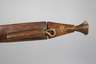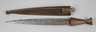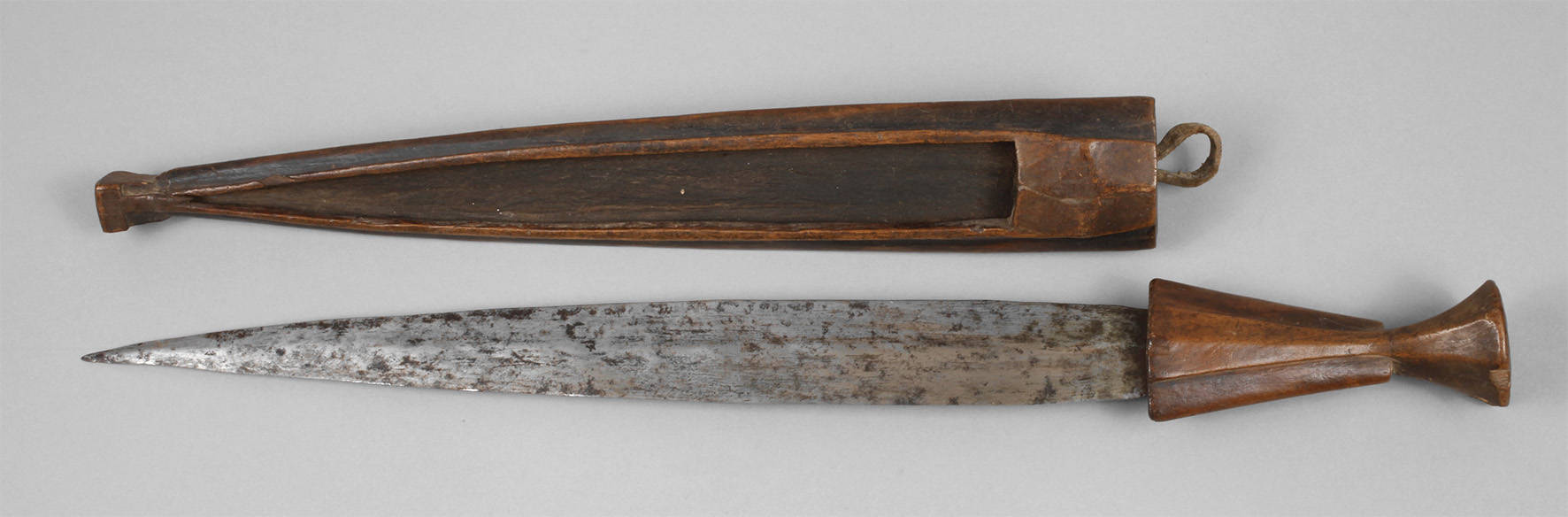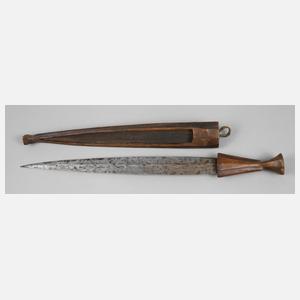 um 1900, geschmiedete zweischneidige Klinge, Griff und Scheide aus einem Holz gefertigt, kegelförmiger Griffknauf, Scheide auf Schauseite flächig durchbrochen, mit Tragevorrichtung, aus einer ethnographischen Sammlung stammend, Fehlstellen am Holz, L ca. 48 cm.