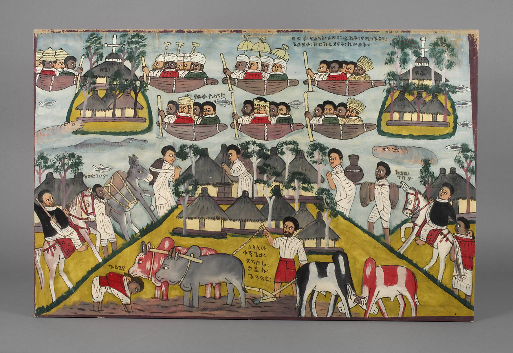 Anfang 20. Jh., unsigniert, mehrfach amharisch bezeichnet, Öl auf Leinwand, auf Keilrahmen, großformatige naive Szene, die im unteren Teil Szenen aus dem täglichen Leben der Landbevölkerung zeigt, während der obere Teil eine christliche Thematik aufgreift, typische Malerei in leuchtendem Kolorit, Altersspuren, Maße 73 x 110 cm.