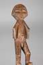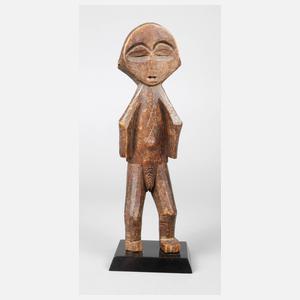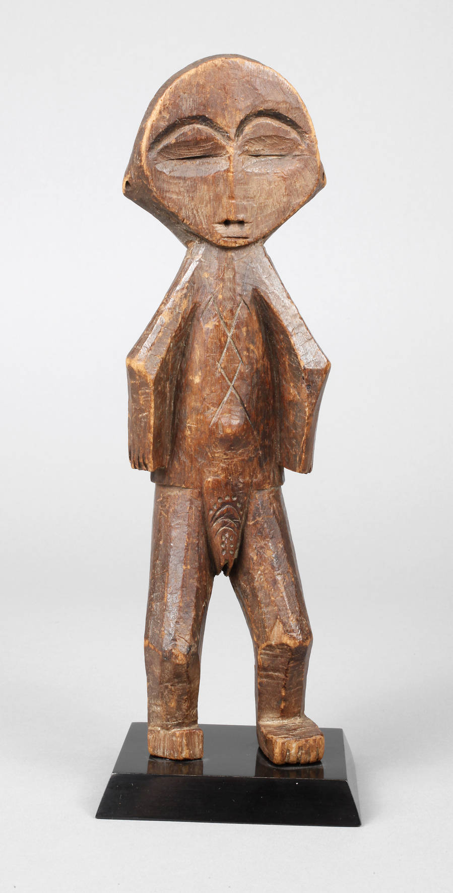 wohl Ghana, Stamm der Ashanti, bezeichnet Anourez 1931, Tropenholz geschnitzt, dunkel gefasst, stehende weibliche Figur in archaischer Formensprache, nachträglich auf flachen Sockel montiert, Substanzverluste, nicht ganz komplett, H 29 cm.