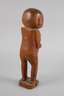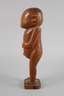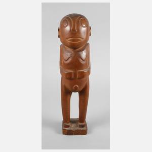 wohl Tahiti, 20. Jh., sog. Tiki-Figur, ungemarkt, Tropenholz beschnitzt, in naiver Formensprache gestaltete stehende Figur auf flacher Plinthe, diese alt repariert, H 45 cm.