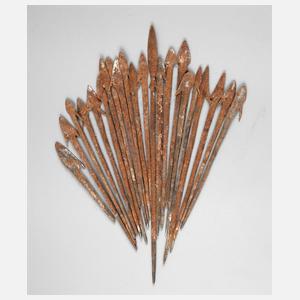 Ende 19. Jh., ca. 22 Stück eiserne Pfeilspitzen mit Widerhaken, aus einer ethnographischen Sammlung, oberflächlich korrodiert, L ca. 15 cm.