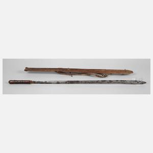 um 1900, schmale geschmiedete zweischneidige (Stich-)Klinge, einfacher Holzgriff mit Lederüberzug, genähte lederne Scheide mit Trageriemen, darauf mit Tusche ”Fau. 19.” bezeichnet, aus einer ethnographischen Sammlung, Klinge stark rostnarbig, Scheide abgenutzt, L 75,5 cm.