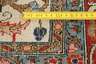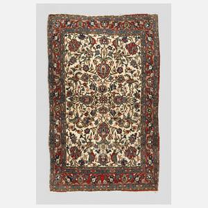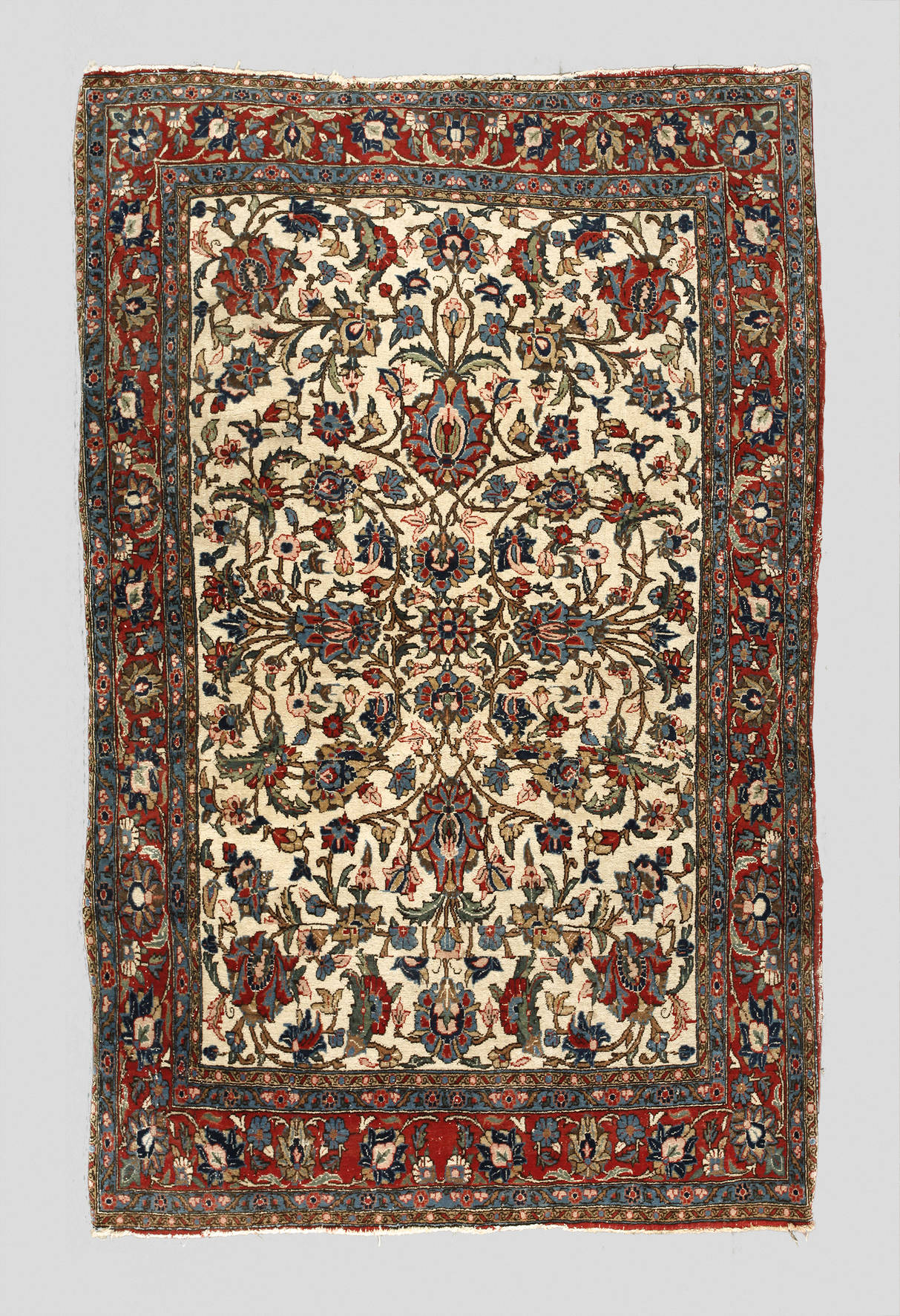 um 1920, reich verziert mit Blüten- und Blattranken über cremefarbenem Grund, gerahmt von breiter Bordüre, Ränder verzogen, Altersspuren, Maße 190 x 126 cm.