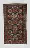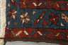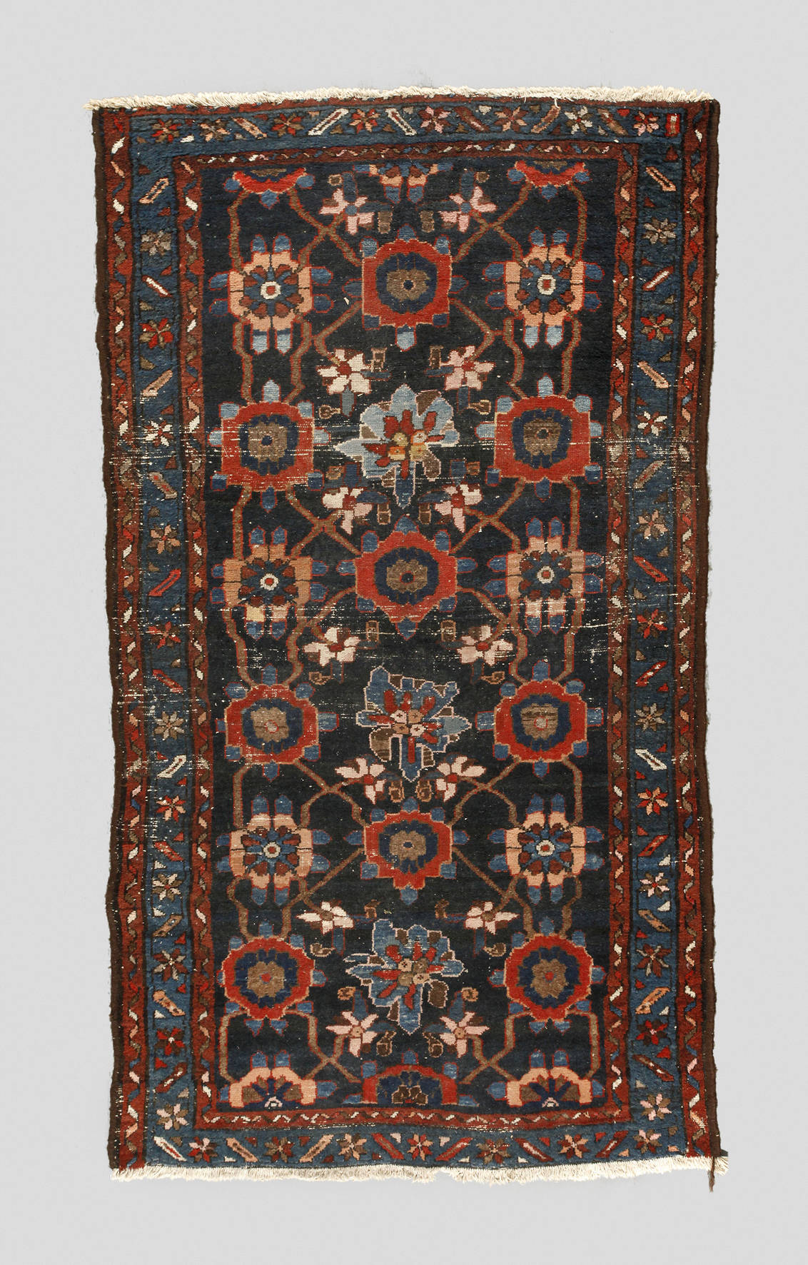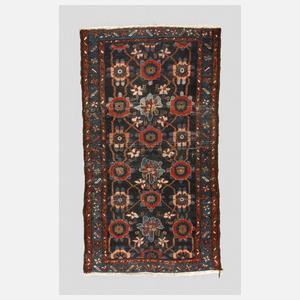 1. H. 20. Jh., stilisierter Floraldekor über dunkelblauem Grund, dreiteilige umlaufende Bordüre, Schmalseiten gekürzt, Altersspuren, Maße 184 x 106 cm.