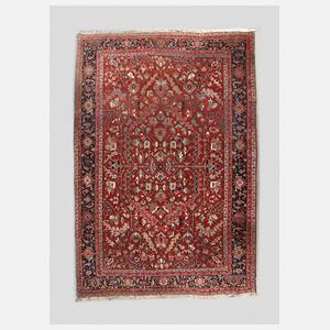 um 1920, floral verzierter Teppich in sattem Kolorit, voll im Flor, kleiner Riss in linker oberer Hauptbordüre, Maße 396 x 307 cm.