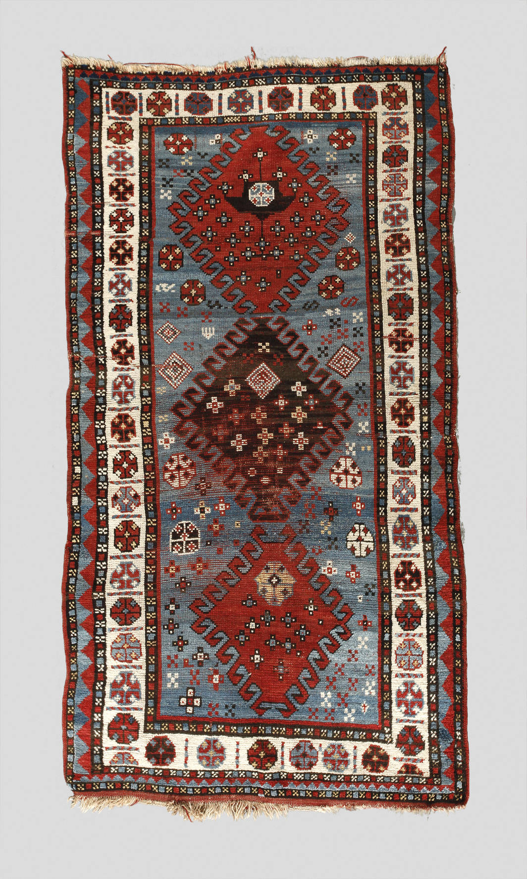 um 1920, großformatiger geometrischer Dekor im Mittelfeld, Fransenbesatz gekürzt, Ablaufspuren im Innenbereich, Maße 180 x 99 cm.
