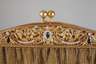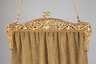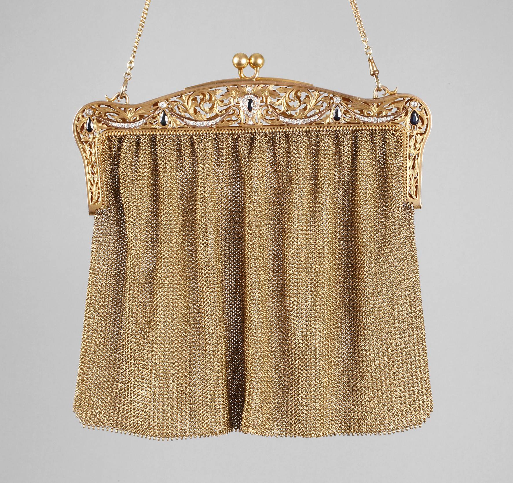 Russland, Anfang 20. Jh., Gelbgold gestempelt 56 Zolotniki und Kopf nach rechts, geprüft 585/1000, Gewebe aus Golddraht, aufwendig gestaltete und durchbrochen gearbeitete Bügel mit fein ziselierter Oberfläche, schauseitig besetzt mit fünf intensiv kornblumenblauen, facettierten Saphirtropfen mit geringen Wachstumsmerkmalen von zusammen ca. 3 ct und ca. 53 Brillanten von zusammen ca. 1,5 ct, Kugelverschluss, hochwertige und seltene Goldschmiedearbeit, Kette wohl ergänzt, Maße ca. 18 x 22 cm, G. Gesamt ca. 326 g.