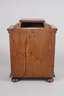 1. Hälfte 18. Jh., Nussbaum und Nussbaummaser auf Nadelholz furniert, zweitüriger Korpus, die Türen und Seiten mit geometrischen Einlegearbeiten, in Vogelaugenahorn, Nussbaumwurzel, Ahorn und Zwetschge, innen drei Schubladen mit unterschiedlichen Messingknäufen, Knäufe alt ergänzt, orig. Schloss und Schlüssel, H 50 x B 36 x T 21 cm.