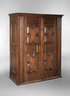 um 1700, Eiche auf Nadelholz furniert, zweitüriger, mittig teilbarer Kleiderschrank, mit reich verzierten und gravierten, inneliegenden Bändern und Schloss, die Türen mit je zwei profilierten Kassettenfüllungen, orig. Schlüssel, zwei Füße fehlen, innen mit späterer Tapete verkleidet, gering rest.bed., H 186 x B 174 x T 66 cm.