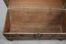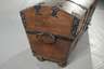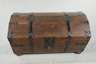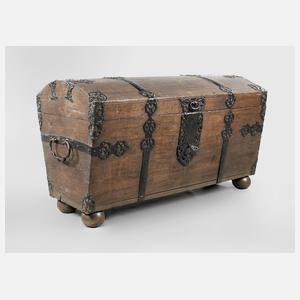 deutsch, Mitte 18. Jh., Runddeckeltruhe aus massiver Eiche, mit dekorativen schmiedeeisernen Bändern verziert, diese durchbrochen gearbeitet, geschwärzt und genietet, original Schloss und Schlüssel, Altersspuren, H 70 x B 124 x T 67 cm.
