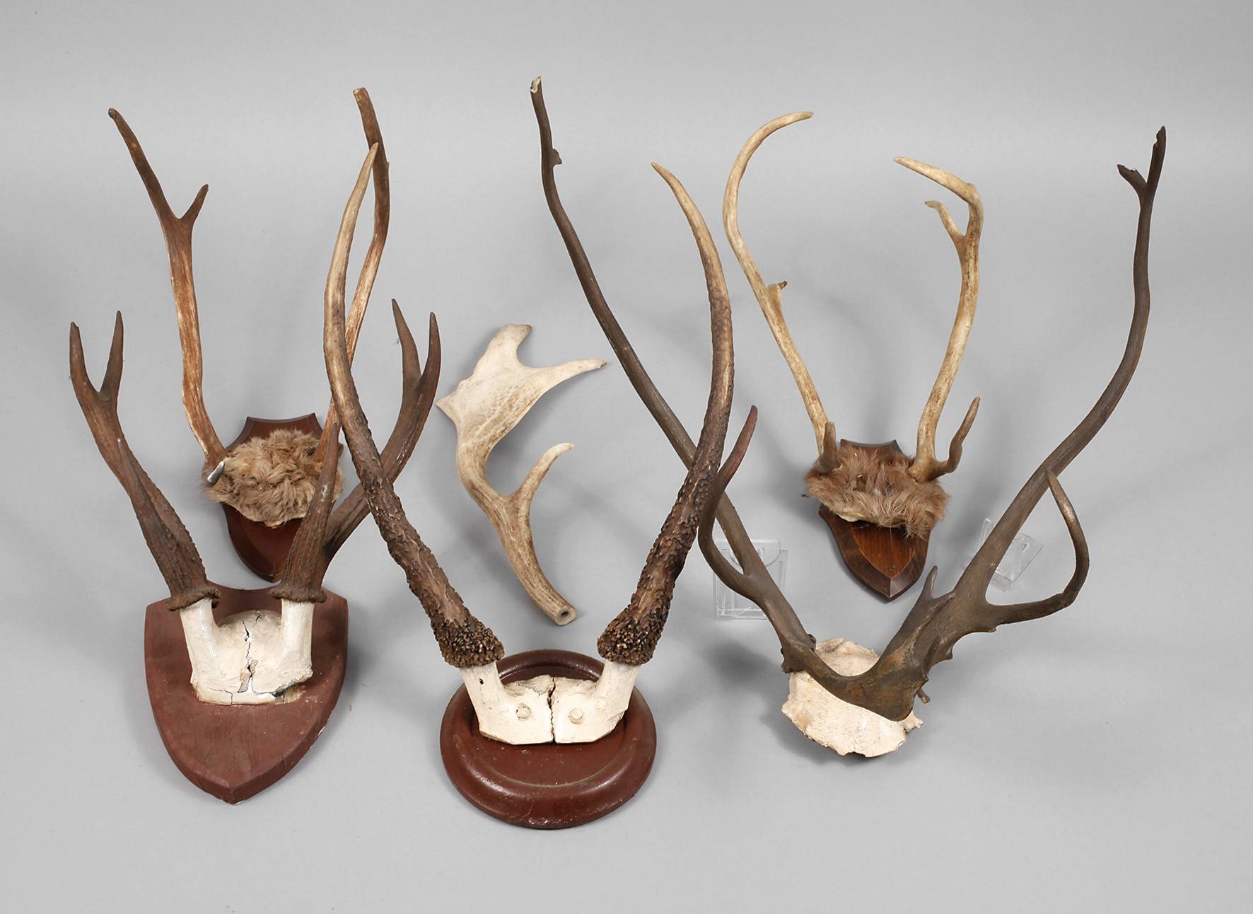 um 1930, fünf Stück, mit Schädelplatten präparierte Rot- und Damwildschaufeln, auf Holzplatten montiert, Altersspuren, H max. ca. 60 cm.