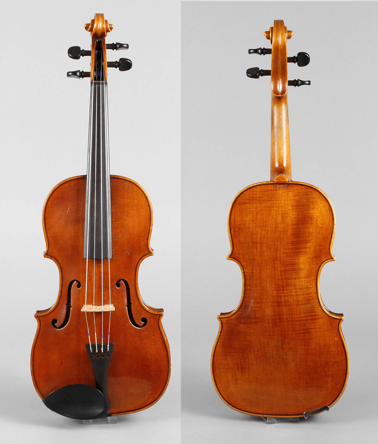 Anfang 19. Jh., Innenseite und Boden mit Brandstempel Hopf, ungeteilter, fein geflammter Boden in bernsteinfarbenem Lack, umlaufende, dreiteilige Randeinlage, rissfreie Decke, Zarge mit kurzem, verfestigtem Riss, sonst guter, spielbereiter Zustand, mit normalen Alters- und Gebrauchsspuren, L Korpus 37,7 cm.