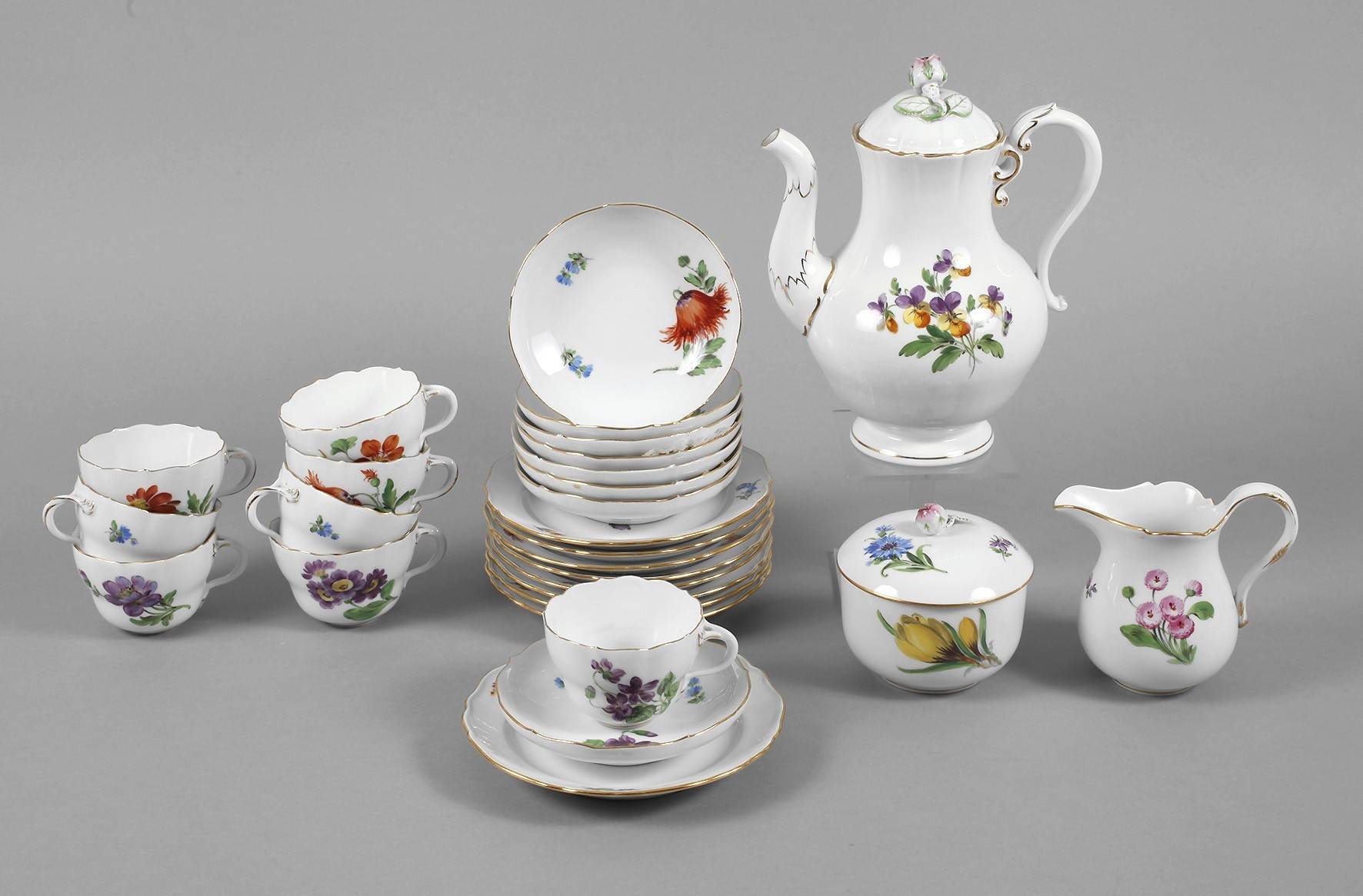 für acht Personen, unterglasurblaue Schwertermarken Pfeifferzeit 1924–1934, zwei Schleifstriche, Form ”Neuer Ausschnitt”, verschiedene Blütenmotive und Streublümchen in polychromer Aufglasurbemalung, Goldstaffage und Goldkante, bestehend aus Kernstück und acht Gedecken, drei Untertassen und ein Teller minimal bestoßen, zwei Tassen später ergänzt, winzige Fehlstelle an der Rosenblüte, H Kanne 24 cm.