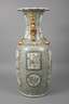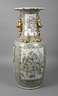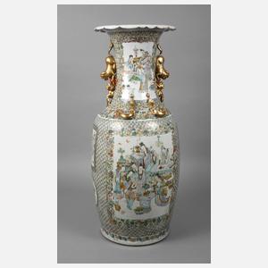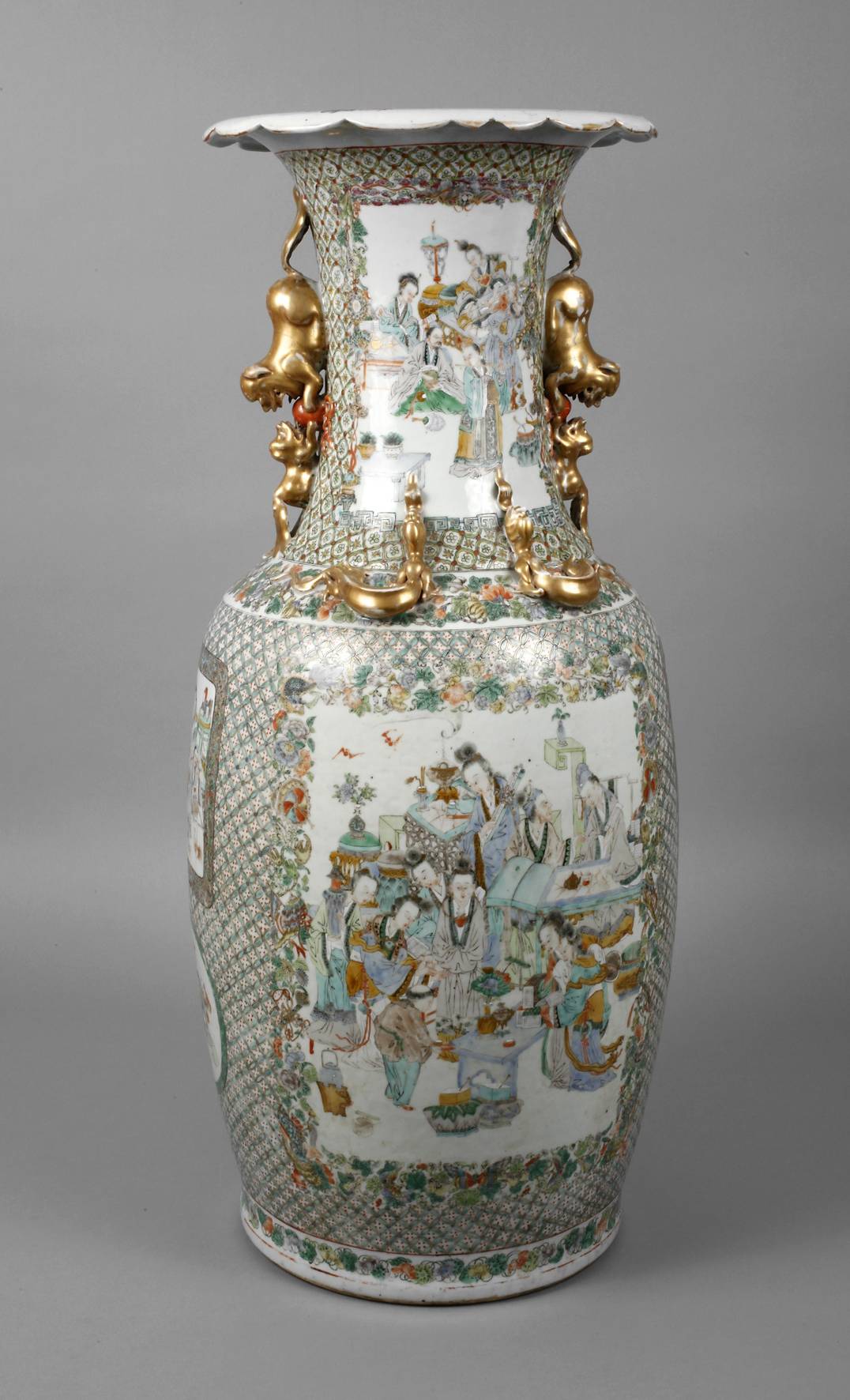 um 1900, ungemarkt, Weißporzellan in polychromer Aufglasurbemalung in der Farbpalette Famille Rose, mit zusätzlicher reicher Goldstaffage, hoher gebauchter Korpus mit kurzer Schulter, zylindrischem Hals und weit ausschwingender, geschweifter Mündung, flankiert von zwei plastischen, in Form von Drachen gestalteten Handhaben, Korpus umlaufend aufwendig ornamental verziert und mit figürlichen Kartuschen staffiert, welche genrehafte Szenen aus dem Alltagsleben zeigen, Boden mit originalen Bohrungen, brandfleckig, Altersspuren, H 91 cm.
