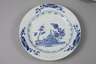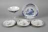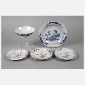 19./20. Jh., dabei Reisschale aus Weißporzellan, am Boden mit Stempelmarke, die Wandung umlaufend mit floraler Emailbemalung, dazu drei Dessertteller, ungemarkt, ebenfalls polychrom staffiert, sowie ein Zierteller in kobaltblauer Unterglasurbemalung mit Landschaftsdekor, unterschiedliche Maße und Erhaltungen, D max. 22,5 cm.