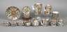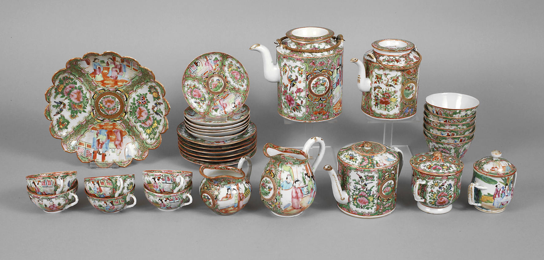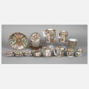 China, um 1920, ungemarkt, Weißporzellan in polychromer Emailbemalung mit Goldstaffage, bestehend aus zwei Kaffee- und einer Teekanne, zwei Milchkännchen und zwei Zuckerdosen, sechs Kaffeetassen, sechs Teeschalen, sechs Untertassen und Tellern sowie einer Gebäckschale, alle umlaufend mit figürlichen Darstellungen verziert und mit mannigfaltigen Floral- und Tiermotiven sowie Ornamentik dekoriert, etwas berieben, Alters- und Gebrauchsspuren, H max. 16 cm.